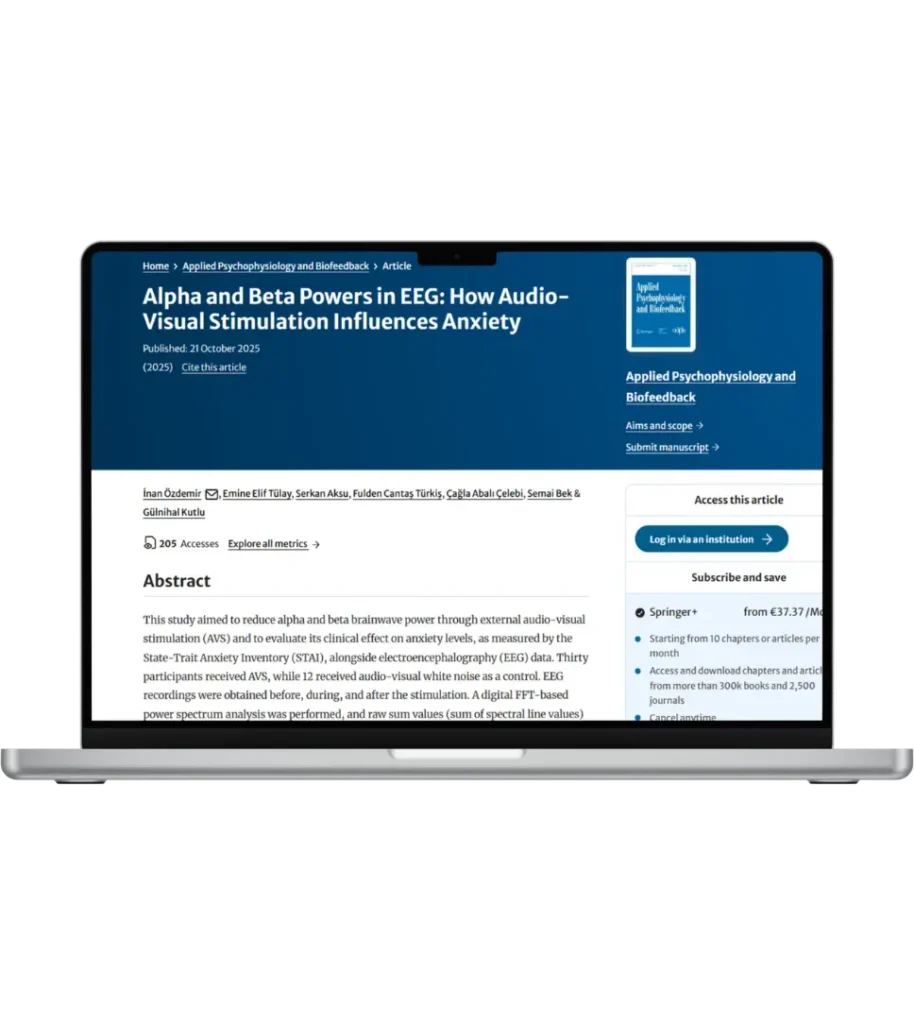 Un estudio de 2025 publicado en la revista especializada Applied Psychophysiology and Biofeedback ha validado científicamente la capacidad de Mistikist para reducir rápidamente la ansiedad mediante su exclusiva estimulación audiovisual (AVS). Utilizando monitorización EEG de 19 canales y pruebas psicométricas estandarizadas, los investigadores descubrieron que el protocolo de Mistikist, que combina pulsos binaurales e imágenes caleidoscópicas, logró una reducción de casi el 50 % en las puntuaciones de ansiedad (de una mediana de 51 a 26) en tan solo unos minutos.