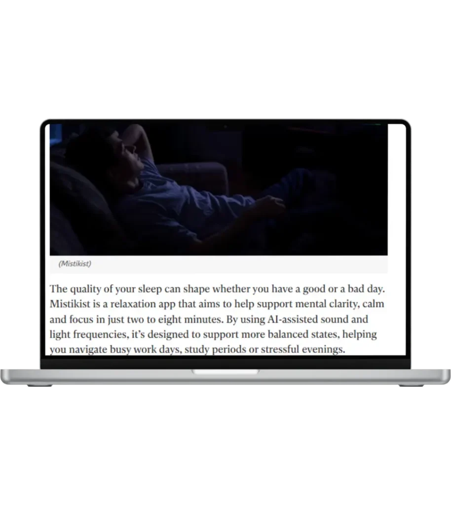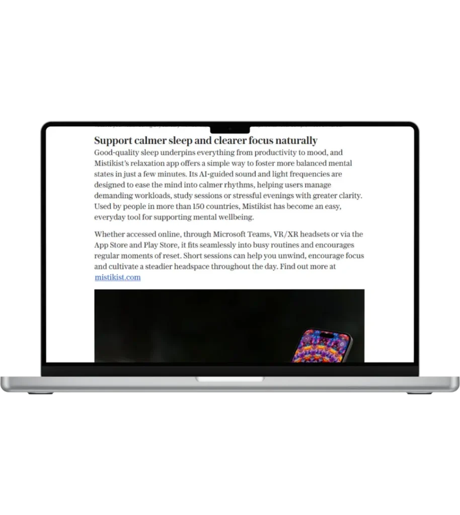 El periódico Independent destaca el uso innovador de frecuencias asistidas por IA que Mistikist emplea para apoyar la salud mental en nuestro mundo acelerado. Al integrar la neurociencia en un sencillo hábito diario, ayudamos a miles de usuarios en 150 países a gestionar el estrés y mejorar su rendimiento. Descubra cómo nuestra tecnología multiplataforma, desde la realidad virtual hasta Microsoft Teams, está estableciendo un nuevo estándar en relajación digital y apoyo cognitivo.
